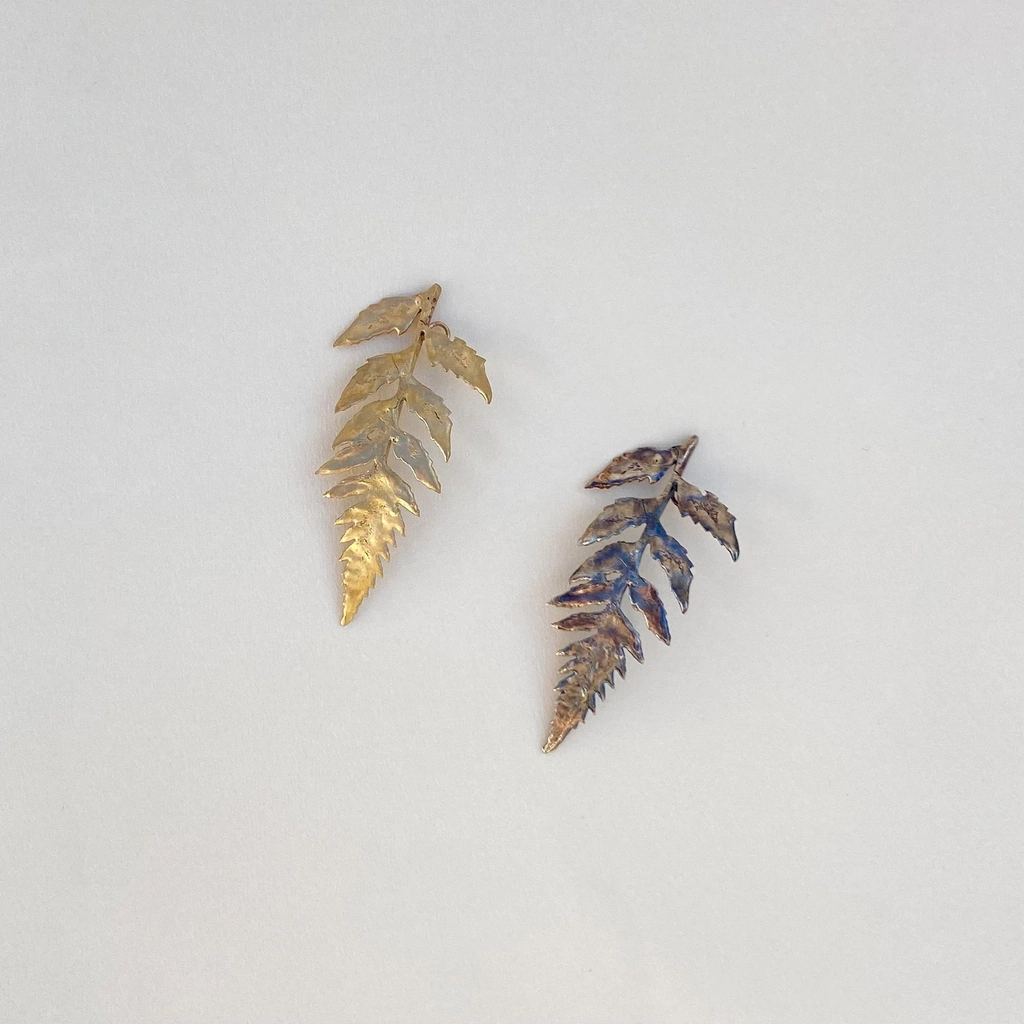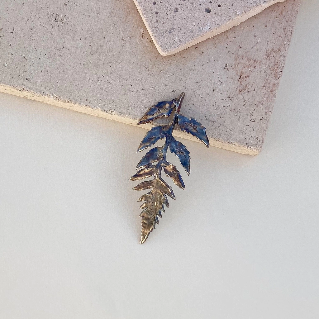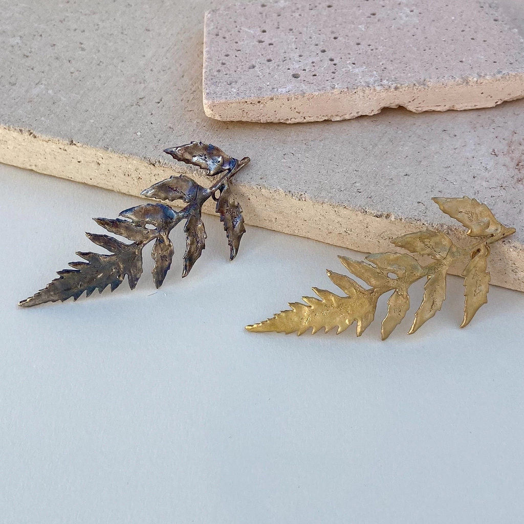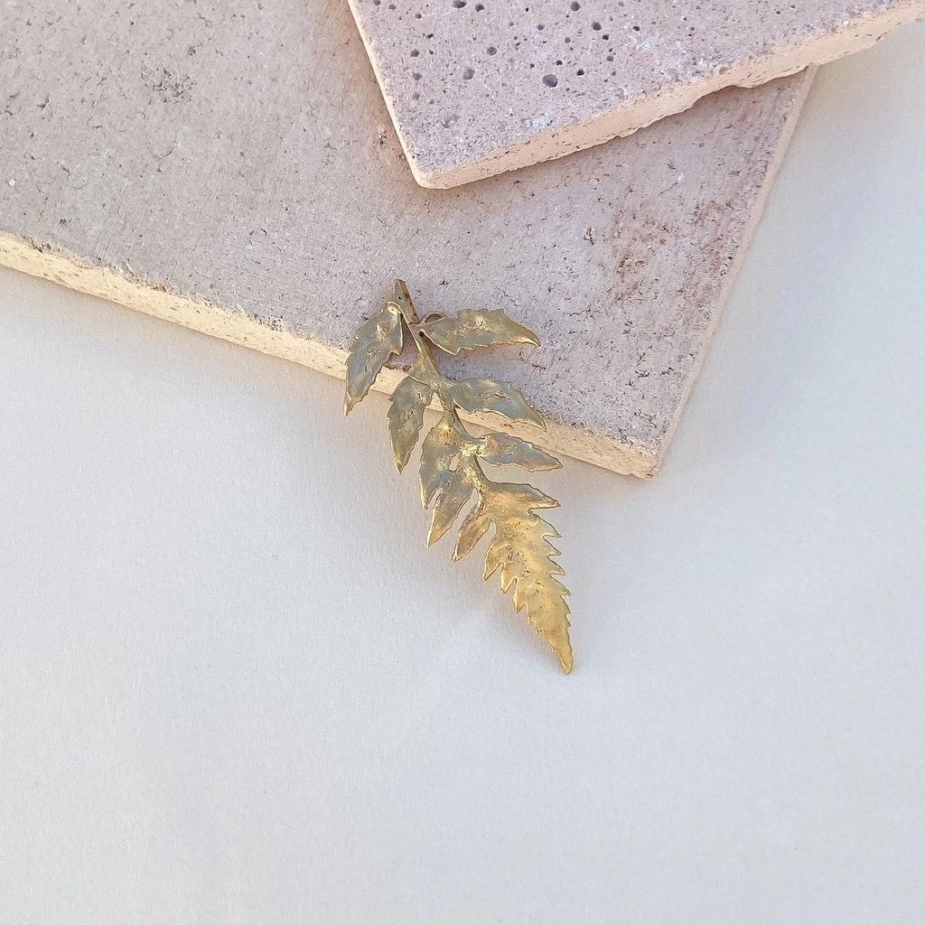 Aplique de bronce con forma de hoja helecho. En el reverso tiene arandelas para ser colocado con invisibles y fijar al pelo. Las medidas máximas aproximadas son de 8 cm de largo y 4 cm en su parte más ancha. Éstas pueden variar levemente (algunos milimetros) ya que son piezas trabajadas a mano. Son piezas delicadas, es por eso que recomendamos cuidado en su manipulación y colocación en el pelo.