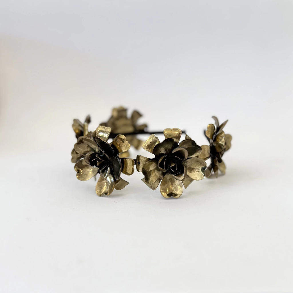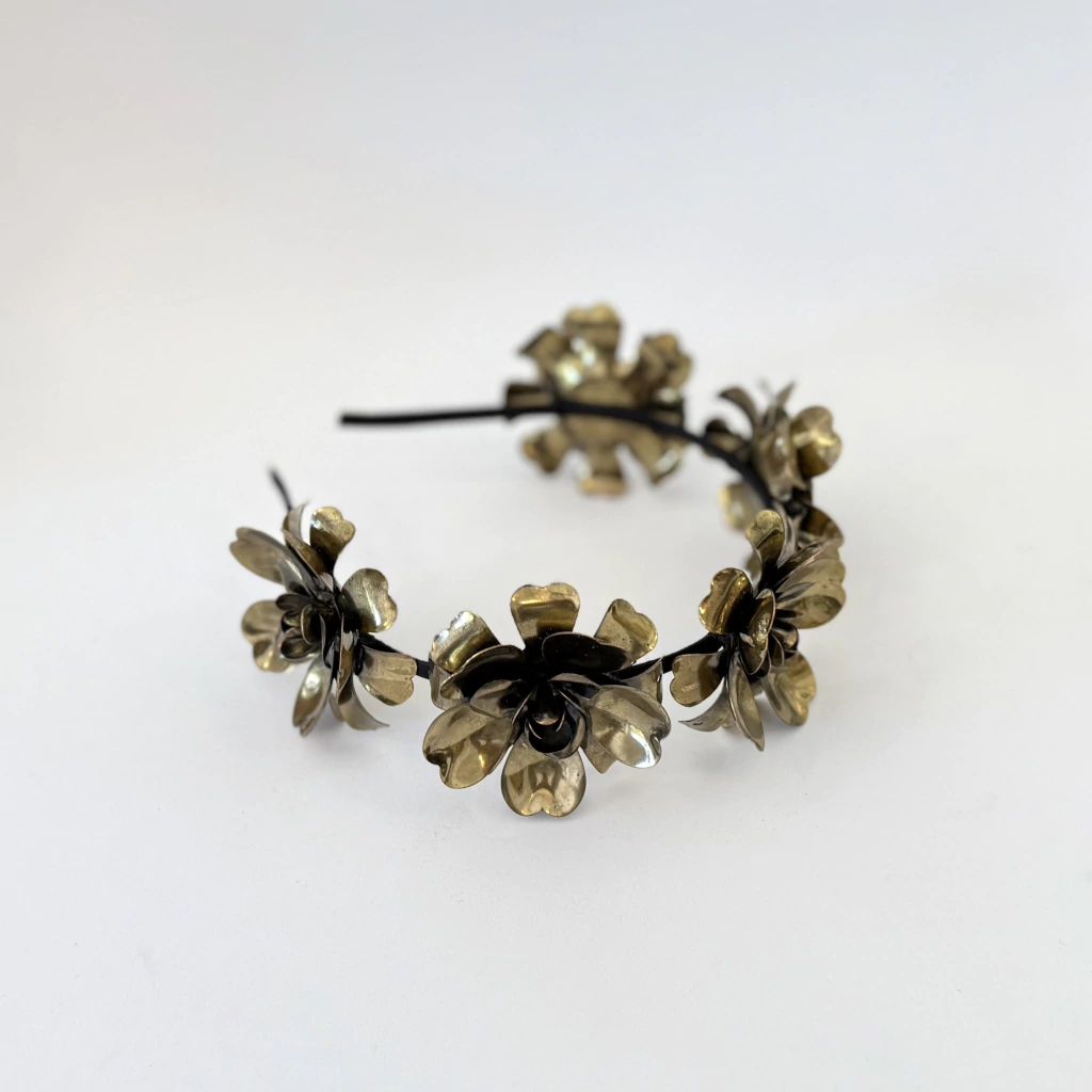 Vincha de base metálica forrada en tela y flores de metal bordadas a mano.