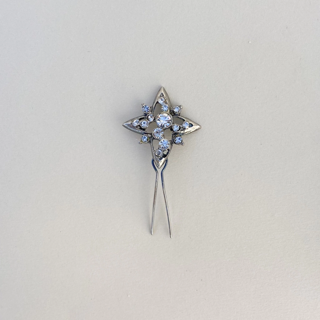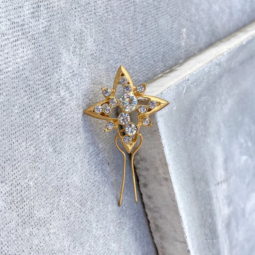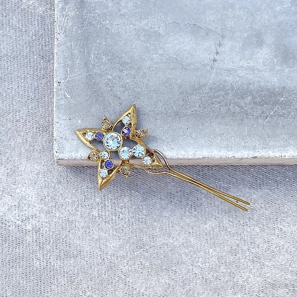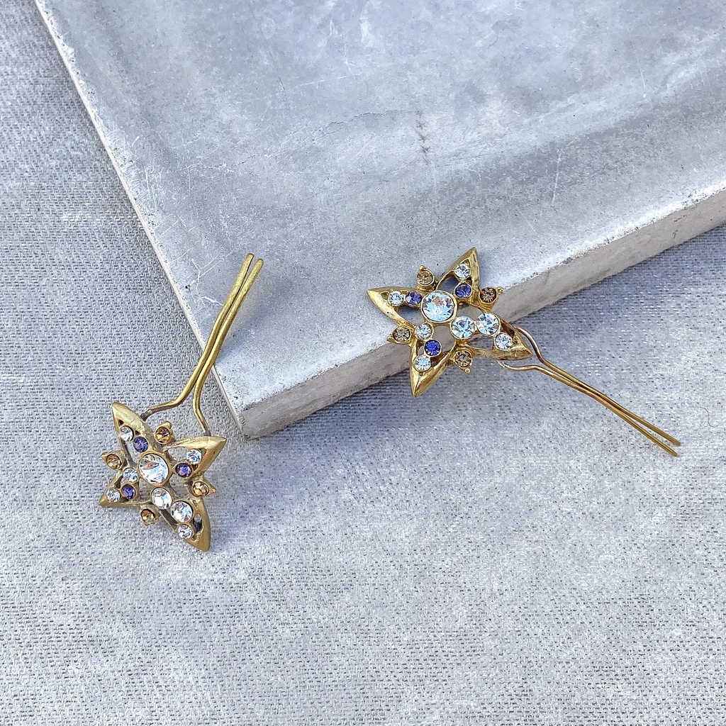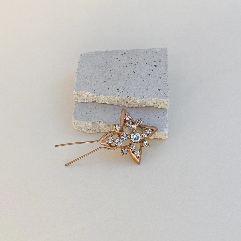 Pin con forma de estrella hecho en bronce y bañado en oro rosé, plata u oro. Tiene cristales aplicados a mano tanto en color transparente como en humo y violáceos combinados.